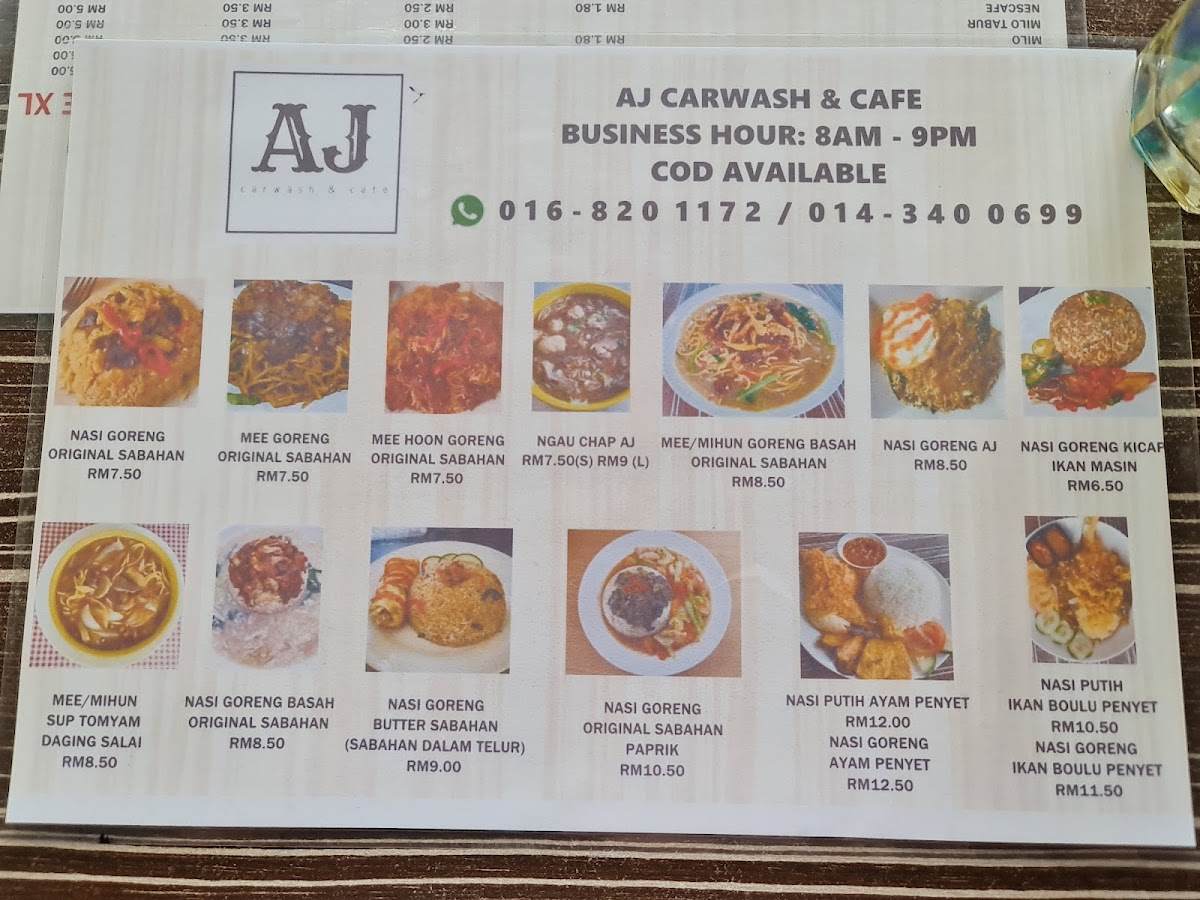 The menu at AJ Car Wash & Cafe offers a variety of local and simple dishes suitable for quick meals and casual dining. Visitors can find traditional Malaysian favorites including rice-based dishes such as Nasi Goreng Sabahan Special and Nasi Goreng Daging Paprik, as well as noodle options like Mee Goreng Daging Salai. There are also other savory items including sausage served with meatball black pepper sauce.