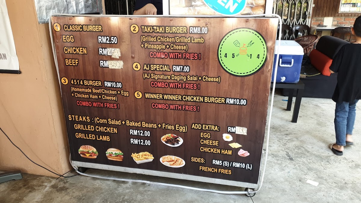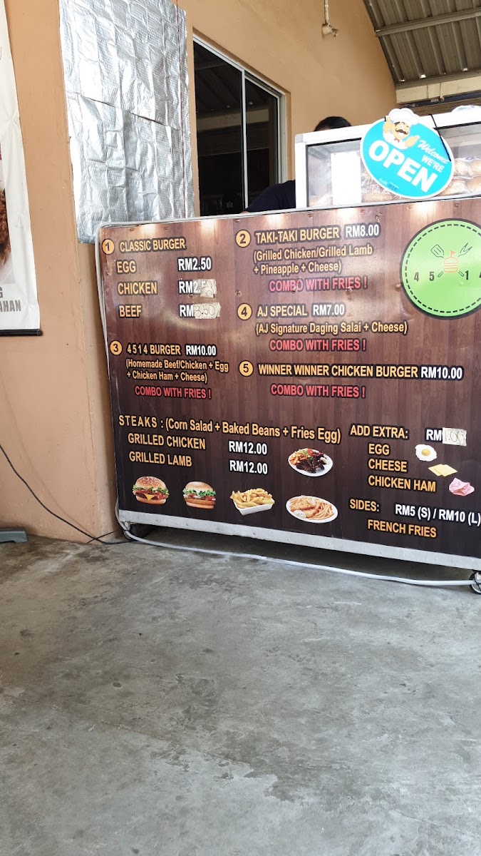 Beverage options include both hot and cold local drinks such as Air Milo AJ, Air Bandung Special, Air Lemon AIS, Lemon Suam, and Lemon Amoi. Additionally, light bites like burgers are available for a casual dining experience.